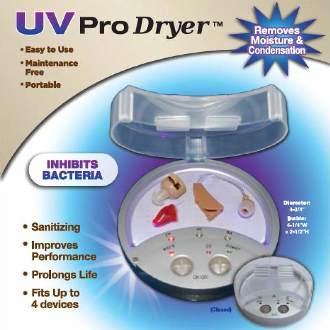 UV Pro Dryer extends the life of your hearing device while keeping it sanitized! It features gentle heat to remove moisture from sensitive electronics. UV technology helps inhibit bacteria growth that could cause infection. Uses no chemicals and features a maintenance-free design. Handy size 4¼ x2½ inside dimensions.Moisture and condensation build-up can affect a hearing aid’s performance over time. UV Pro Dryer helps remove moisture and condensation from the device by releasing heat moderately. In addition, it is also built with UV lights to eliminate/reduce bacteria that can cause itchy or irritated ears. UV Pro Dryer is a cost-effective and environmentally friendly way of cleaning hearing aids – chemical free! The set includes 1- UV Pro Dryer Unit and 1- Adapter Cord (Hearing Aid not included.)
