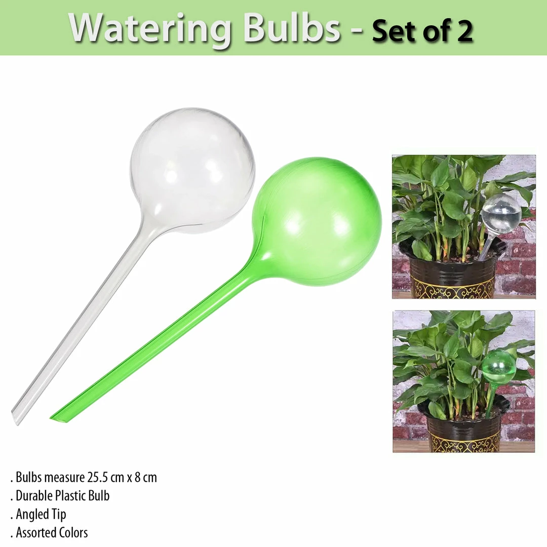 Easily keep plants watered with this convenient Garden Watering Bulb featuring a durable plastic bulb with a long stem with an angled tip. Simply fill the bulb with water and insert the stem into soil. Water is dispersed slowly as needed, until the bulb empties.Assorted Colors and styles will ship.