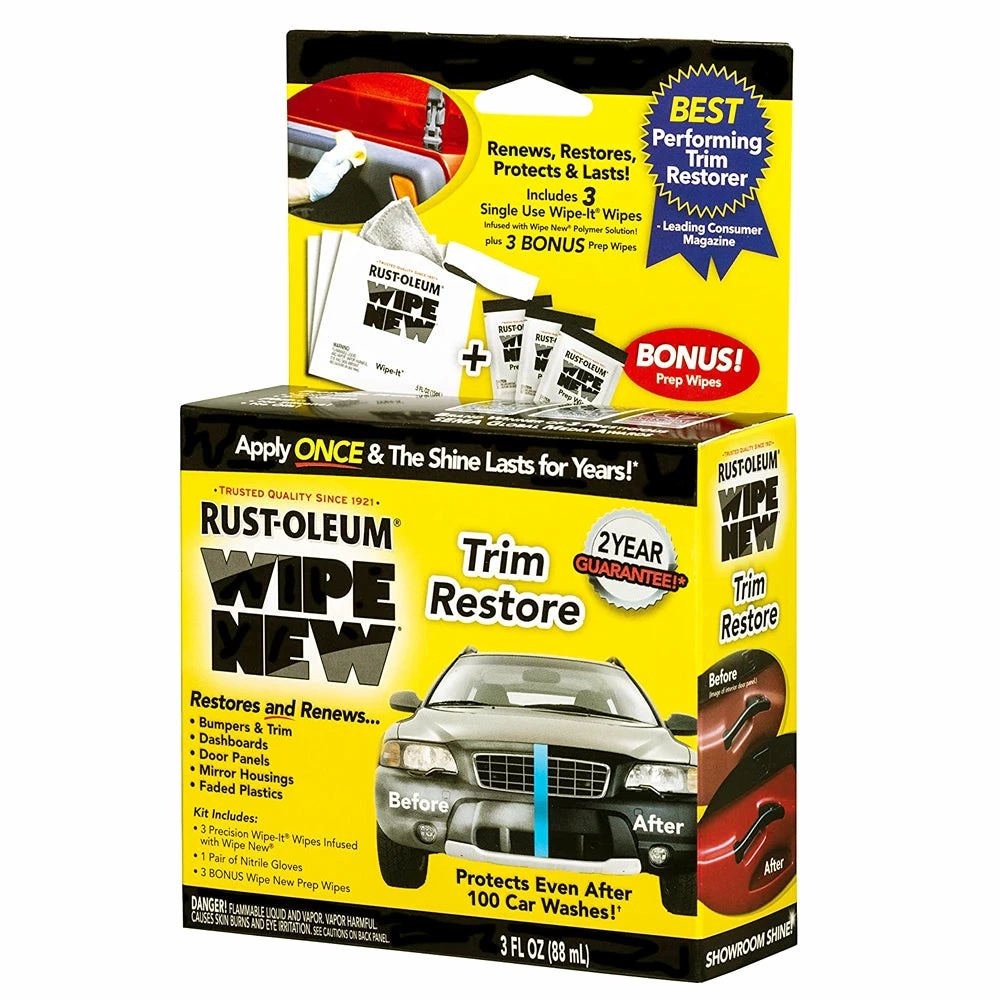 Wipe New Trim Restore- The Wipe New Trim Restoration Kit returns weather-faded or grayed-out trim to showroom-like condition while giving it an extra layer of protection. The DIY kit includes everything needed to treat the total interior or exterior of one mid-sized sedan and is ideal for use on cars, trucks, vans, motorcycles and more. Just one application renews vehicles’ plastic, vinyl and rubber for upwards of two years.ust-Oleum Wipe New Trim Restore is designed to renew, restore and protect worn automotive trim and plastic for years. Great for door panels, trim, side mirrors, bumpers, dashboards, leather and vinyl seats and more. Works on any color and protects surfaces from corrosion, fading and weathering. Apply in indirect sunlight and protect the surface from moisture for 24 hours post-application.