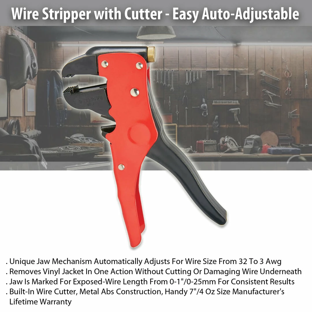Get perfect insulation stripped wires every time- ready for soldering, wire nuts, or terminal. Unique jaw mechanism automatically adjusts for wire size from 32 to 3 awg