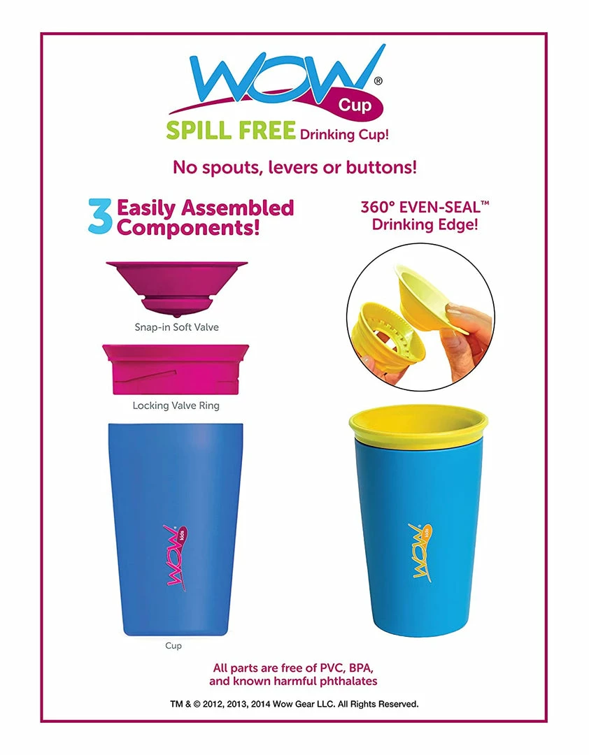 Innovative Spill Free Drinking Cup for Kids that is age-rated from 12 months to early adolescents. Features a 360° EVEN-SEAL drinking edge!No spouts, levers or buttons! The Wow Cup provides lots of fun as training cup or as an everyday cup for the entire family at home, school or on the go. It’s small enough to be handled by those children exhibiting advanced coordination in the early toddler years and big enough to be used by older children without it looking like a baby cup. Parents even love to drink from them. The spill free design virtually eliminates any messy clean-up and because there are no spouts and straws, the 360° Uni-Flow drinking edge provides a healthy alternative that helps toddlers develop the oral and motor coordination to transition into a regular open round cup sooner. The no-spout and no-straw design helps in the prevention of potential Orthodontia issues due to long term sucking on spouts. Drink through gentle sucking without the need to press buttons, move levers, or sip on straws and spouts. The 360° Uni-Flow drinking edge allows you to just pick up the cup and drink anywhere along the rim. After drinking, the valve automatically seals itself until you take another drink. The Wow Cup is spill free, worry free and hassle free! There are only 3 parts for easy assembly, disassembly and cleaning. It also comes in a matte finished which helps the child grip the cup more firmly and provides for a compatible surface to write your child’s name on the cup with permanent marker. Ships in mail order packaging. Pack of 2