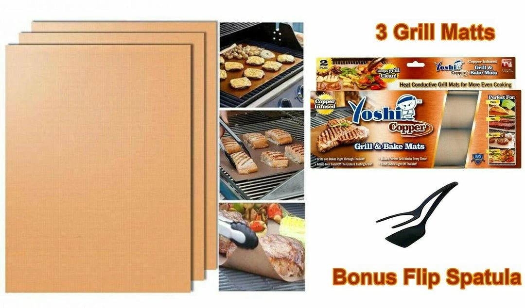 Contains 3 Copper Mats: 3- 15.75 in. x 13 in. and a bonus Flipper Spatula (Ships in non-retail packaging)